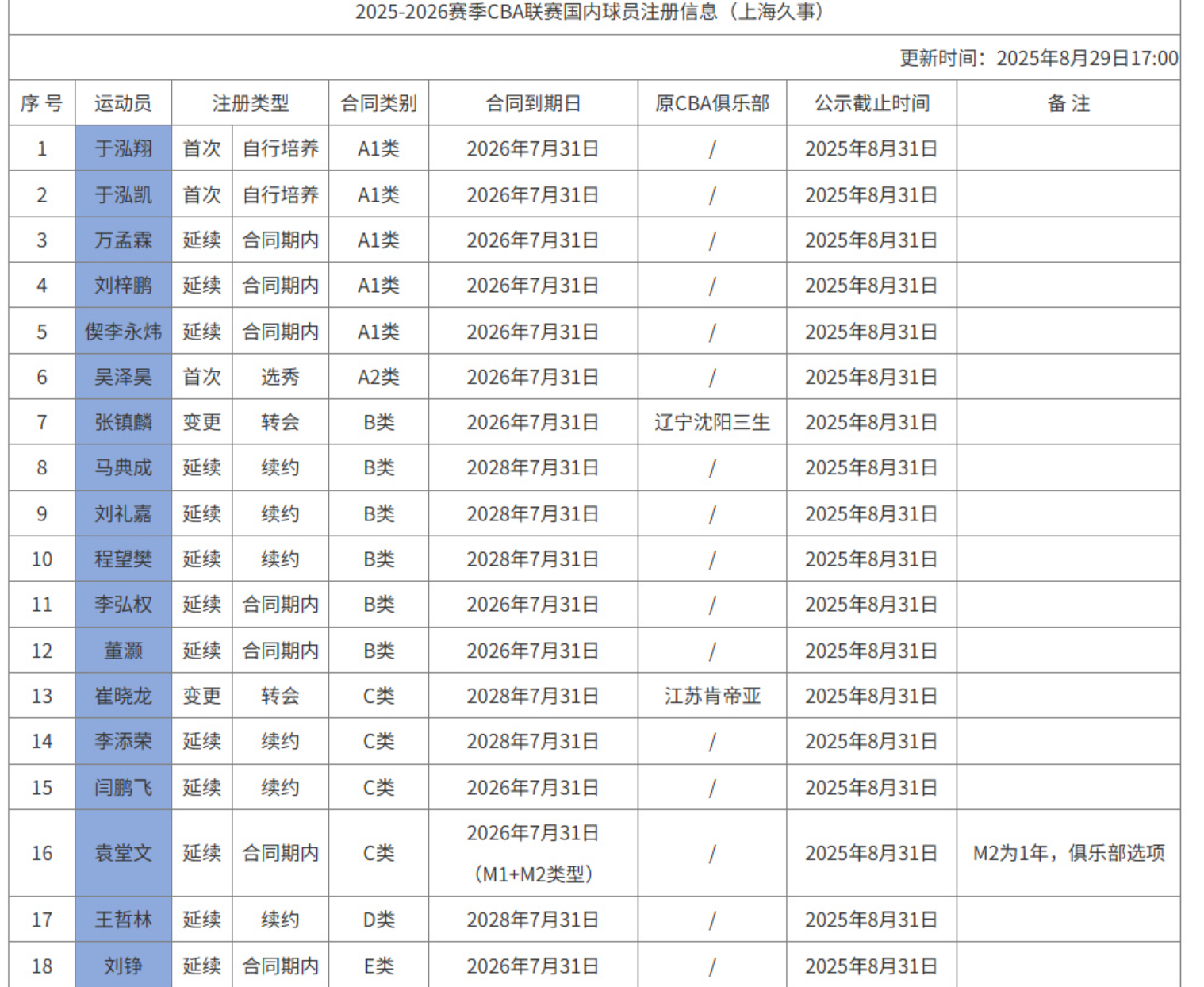2025年8月29日继续更新注册名单,这期间焦点还是比较多的。其中徐昕只是租借到广州,这是让人意外的举动了。当然之前双方达成了回购条款,可能也是因为这个条款,所以显示是租借。按照之前公布的动态,广东可以在第二年和第三年回购,第四年就属于广州的了。