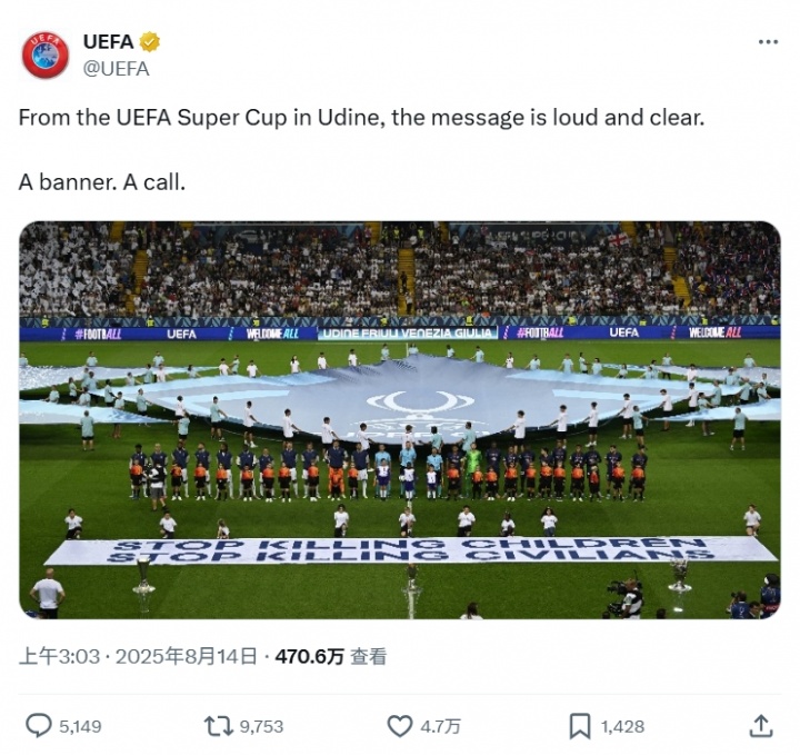 赛事主办方通过社交媒体强调:"乌迪内球场传递的讯息清晰有力,一条横幅代表千万人的心声。"虽然标语未指明具体对象,但欧足联特别邀请两名巴勒斯坦难民儿童参与颁奖环节的举动,传递出明确的人道主义立场。